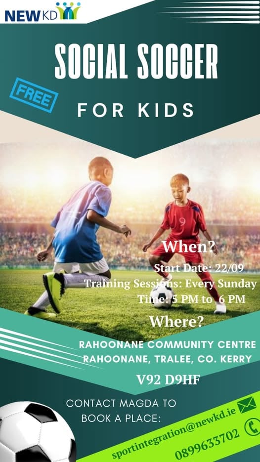 Soccer for kids starts on August 8th at Rahoonane Community Centre. Training sessions are every Sunday and they are free! Kids aged between 6 and 12 years old are all welcome. See the image below for further details.